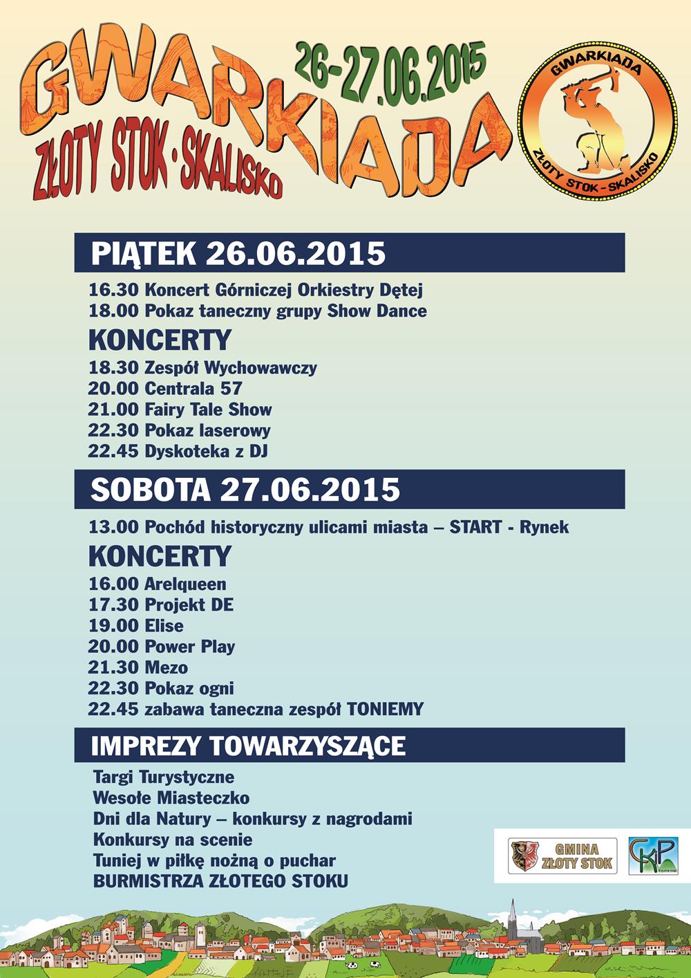 Pani Burmistrz Grażyna Orczyk we współpracy z Centrum Kultury i Promocji w Złotym Stoku zorganizowała obchody, obok których nie sposób przejść obojętnie. „Gwarkiadę” patronatem honorowym objął sam Marszałek Województwa Dolnośląskiego Cezary Przybylski. Obchody święta zgodnie z wcześniejszą tradycją odbyły się na terenie Leśnego Parku Przygody „Skalisko”, w miejscu dawnego kamieniołomu. Sobotnią część imprezy rozpoczął dopracowany w każdym szczególe historyczny korowód ulicami miasta. Na Złotostockiej scenie zaprezentowały się utalentowane zespoły m.in.: Projekt DE, Arlequenn, Feelings Station, Elise, zespół Power Play miejscowa Górnicza Orkiestra Dęta, Centrala 57, Zespół Wychowawczy, Fairy Tale Show, a gwiazdą sobotniego wieczoru był MEZO. Widowiskowy pokaz laserowy i imponujący pokaz sztucznych ogni z pewnością pozostaną w pamięci uczestników na długi czas… powrót do wspomnień imprezy umili klip, który przygotowała STVP!